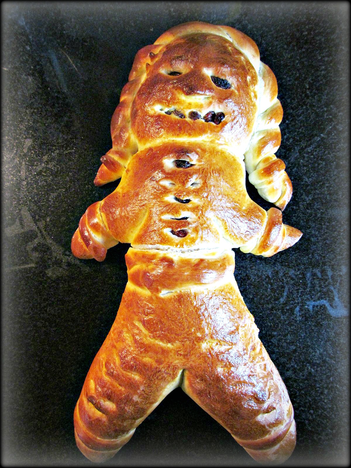 Aus dem Teig Männchen formen. Dazu ein Stück Teig abschneiden, eine längliche Wurst rollen, mit der Handkante den Hals andeuten und den obern Teil zum Kopf drehen. Mit der Schere Arme und Beine einschneiden, ebenso das Gesicht. In die Augenhöhlen je eine Rosine drücken.