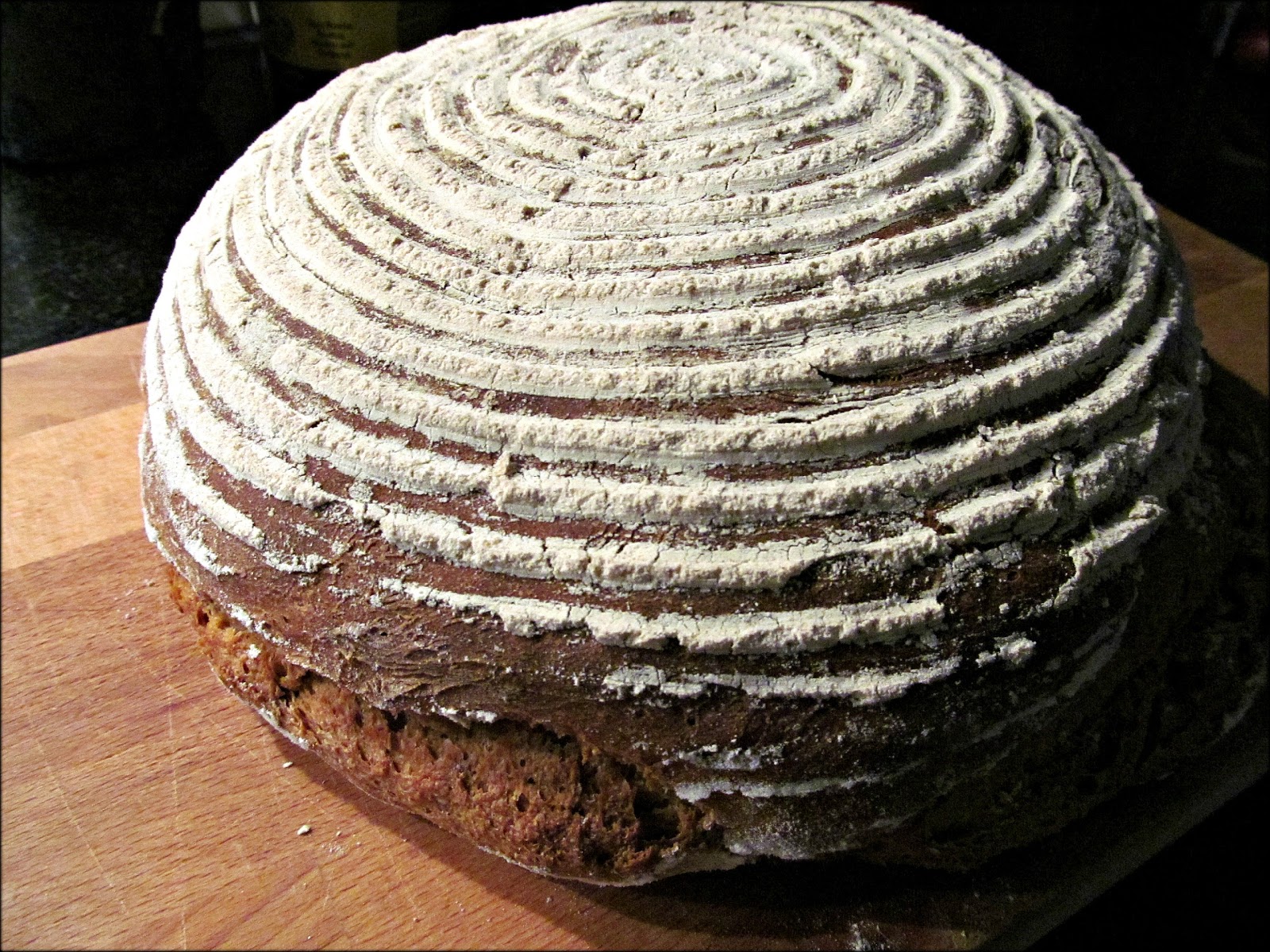 Mein zweites Sauerteigbrot war ein Roggenbrot (siehe erstes Bild und das hier folgende), ebenfalls nach einem Rezept von Franz. Ich hab ein bisschen bei den Gewürzen abgeändert, da ich letztens ein Brotgewürz gekauft hatte und das unbedingt ausprobieren wollte. Das Rezept für das Roggenbrot ist wesentlich einfacher, sprich weniger aufwändig, als der Schwarze Hamster. Schmeckt aber auch sehr lecker und ist aussen schön knusprig. Gehört mittlerweilen auch zum Standardrepertoire.