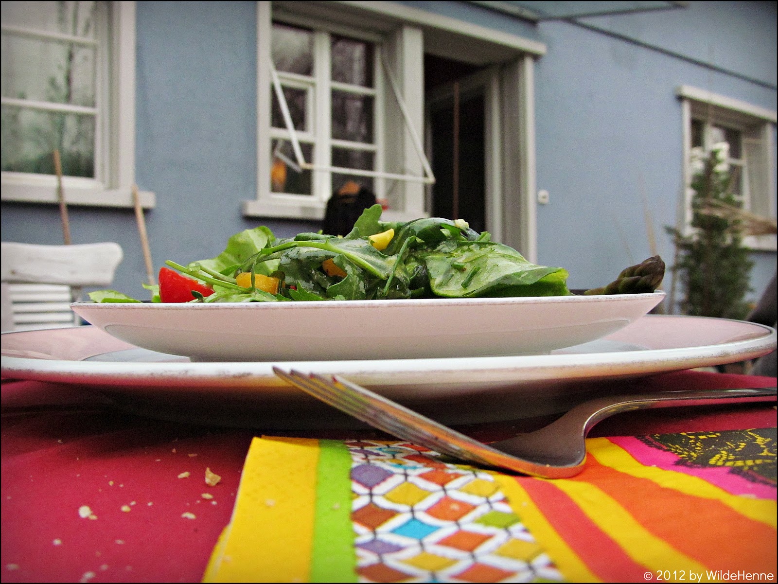 Dann wurde ein Salätchen mit Grünspargel serviert. Sehr lecker. Während unsere Freund M. sich in der Küche dem Safranrisotto widmete, kümmerte sich seine Frau V. um das Grillfleisch. Und ich konnte locker den für mich kochfreien Abend geniessen.