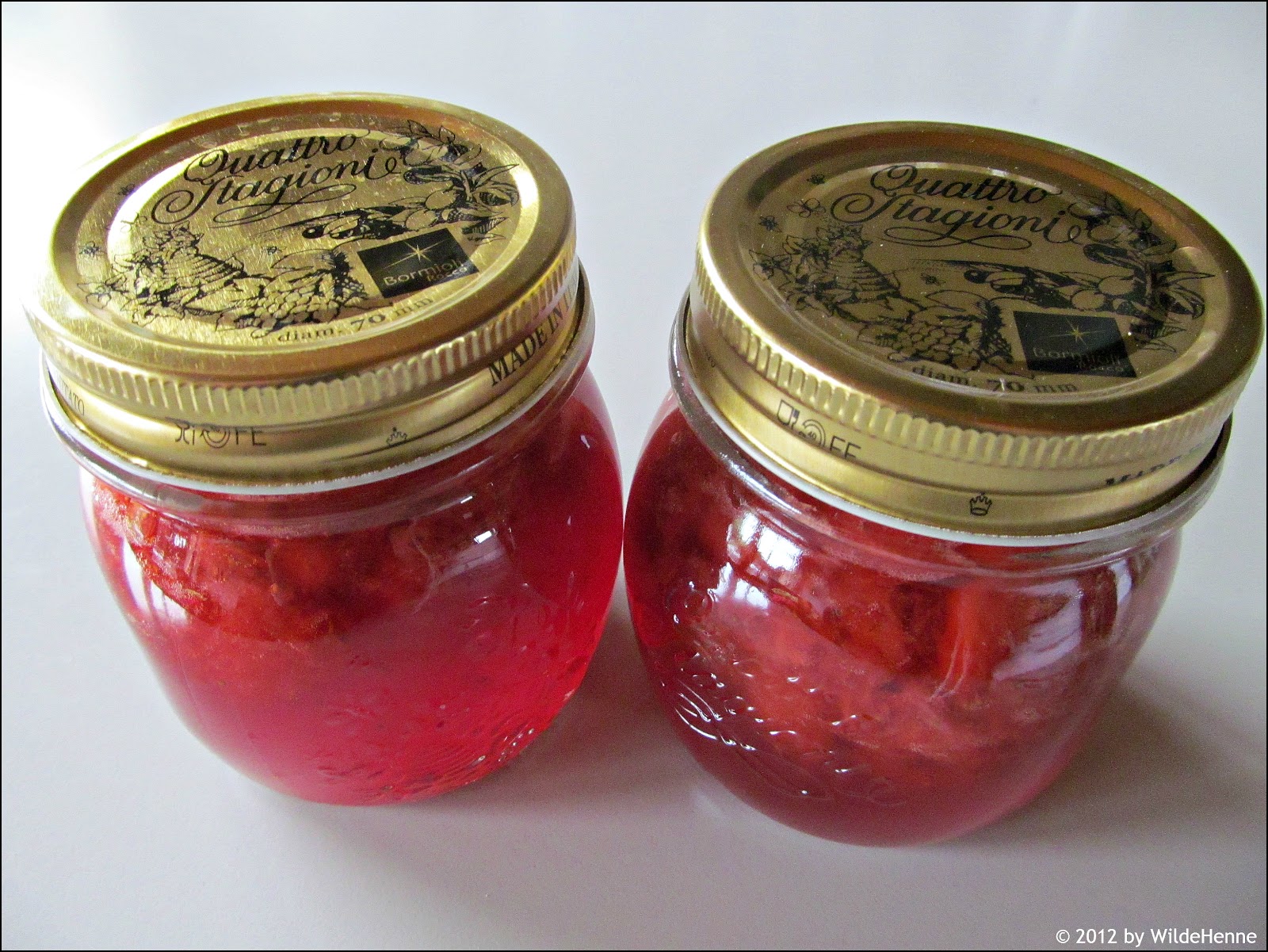 Alles zusammen aufkochen, 4 Minuten sprudelnd kochen lassen, heiss in Gläser abfüllen, diese verschliessen und 3 Minuten auf den Deckel stellen.