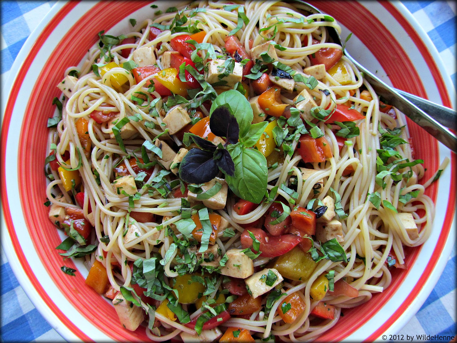 Endlich Sommer, wunderbares Wetter, heiss, die Sonne brennt vom Himmel – ich liebe das! Und sobald die Temperatur über 25 Grad klettert, schreit der Hühnerhof: «Sommerspaghetti!» Gerne doch! Das Rezept stammt von meinem Schwager, der ist Italiener. Vor vielen Jahren war’s, das Küken war noch ein Winzling ohne Zähne. Aber wenn mein Schwager Sommerspaghetti auftischte, schrie sie immer ganz begeistert: «Da – ha!» (Da, haben!).
