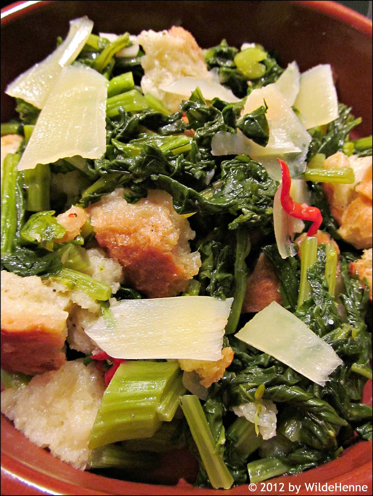 In einer grossen Pfanne den in Scheiben geschnittenen Knoblauch und die Peperoncinoringli sanft anziehen. Cime di Rapa waschen und in ca. 2 bis 3 cm lange Stücke schneiden, noch nass in die Pfanne geben. Claudio bedeckt nun das Ganze knapp mit Wasser. Das habe ich nicht gemacht. Vom Waschen war da genug Wasser an den Blättern, so dass ich keine zusätzliche Flüssigkeit mehr brauchte. Jetzt das Ganze ca. 15 Minuten dünsten, dann salzen und pfeffern. Das harte Brot in Stücke teilen und zum Gemüse geben, ein bisschen reindrücken, damit sich das Brot mit dem Gemüsesud vollsäuft. Anrichten und Pecorino oder wie bei mir eben Sbrinz drüber hobeln.