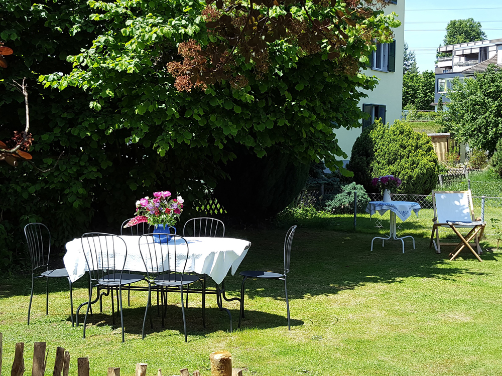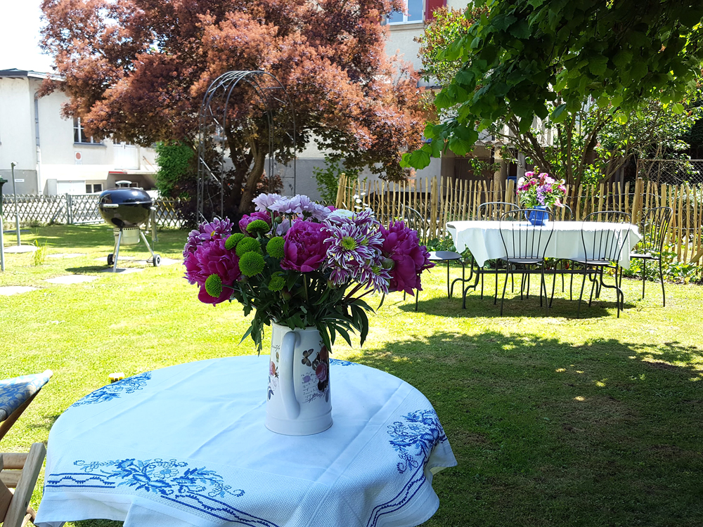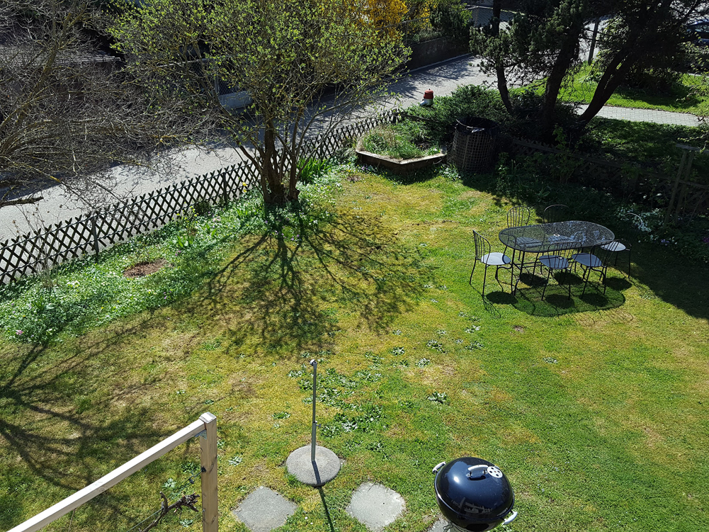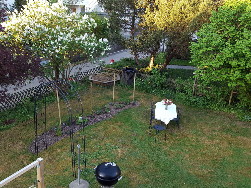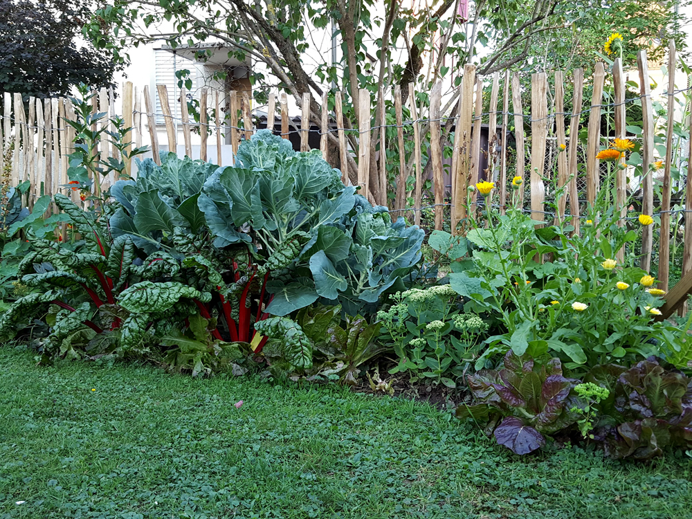 Ich habe mit Rittersporn, Fingerhut, Akelei, Pfingstrosen etc begonnen, das Beet zu bepflanzen. Ich habe bei meiner Mutter Mohn, Phlox und Frauenmantel ausgebuddelt und mit viel Muttererde in meinem Beet eingepflanzt. Habe Rosen bestellt, und zusammen mit Lavendel eingegraben. So gegen Mitte Mai wurde es langsam nett hier. Also Tischdecken, Liegestühle etc. raus. Und weil es im Beet noch nicht so richtig blühen wollte, mussten Blumen auf die Tische. Aber im Beet sah es noch so leer aus. Also dachte ich, jetzt muss ein Füller rein: Kopfsalat, Stielmangold und Rosenkohl. Das Küken hat aufgeschrieen: «Mist, was willst Du mit 6 Rosenkohlstauden? Wenn das dumm läuft, haben wir am Schluss 36 kg Rosenkohl!» Ich wollte den Rosenkohl ja nicht eigentlich wegen des Rosenkohls, sondern, weil ich die Stauden optisch toll finde! Hingegen, gegen die 3 roten Stielmangold hatte sie nichts einzuwenden.